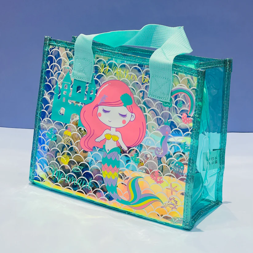 - Eye-catching Design: Features a holographic material that reflects rainbow colors, along with unicorn/mermaid prints.