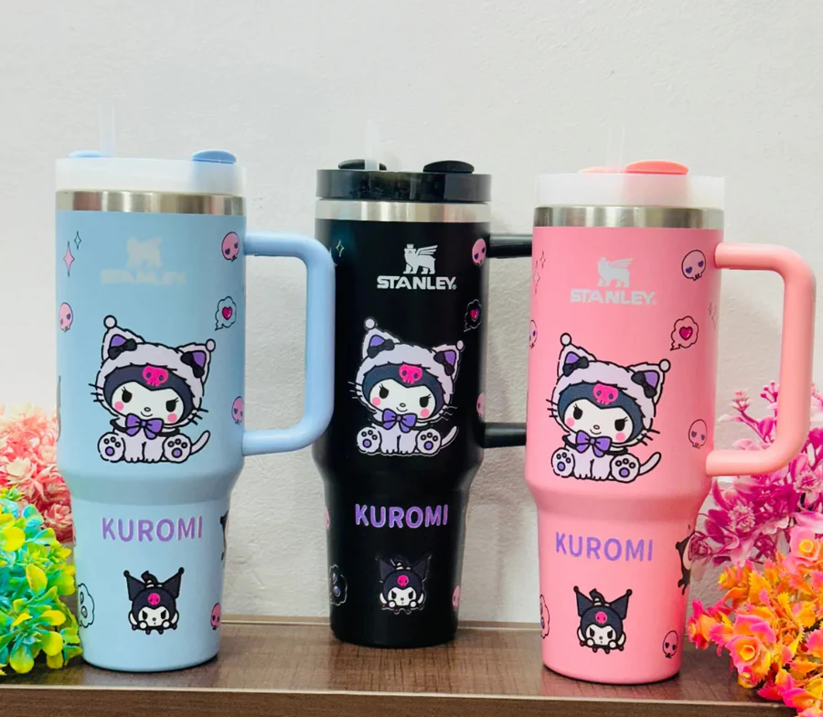 Make every sip cuter with the Pink Kuromi Stanley-Style Tumbler, designed for Sanrio lovers and fans of all things kawaii! Featuring a soft pastel pink finish and adorable Kuromi illustrations, this tumbler adds a playful touch to your everyday routine.