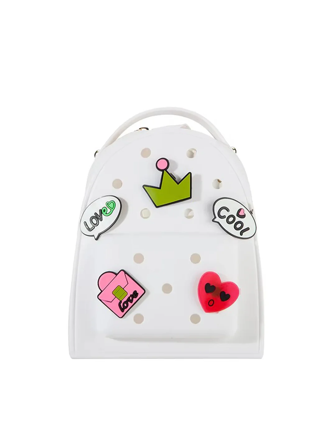 Includes 5 removable graffiti-style charms. Front perforated holes let you mix and match your look for beach parties, holidays, or daily style upgrades.
